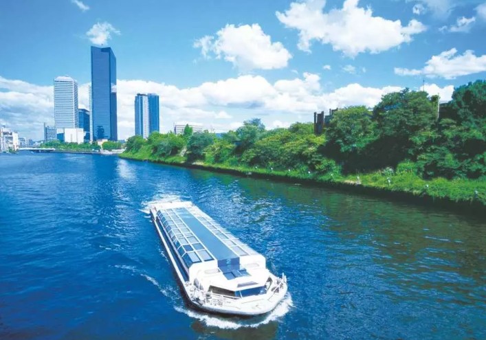 수상버스를 타고 오사카 도심의 고층 빌딩의 아름다움을 감상해보세요.