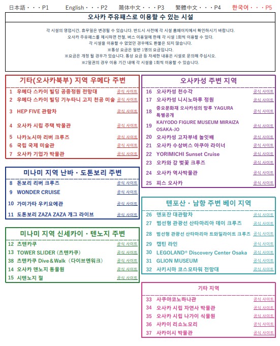 ▪️오사카 주유 패스 소지자는 운영 시간 동안 각 시설에 입장할 수 있으며, 모든 주요 교통 수단의 첫 번째 열차부터 막차 열차까지 이용하실 수 있습니다.